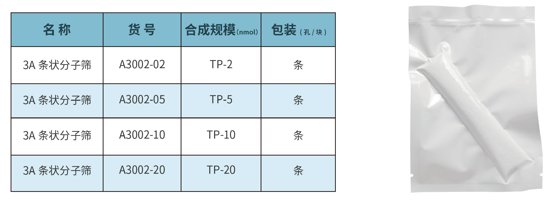 條狀分子篩用于吸附溶劑和溶液中的微量水。最初是為合成寡核苷酸而設計的,方便、無灰塵、無絨布,可添加到多種溶劑和有機溶液中去除含有的微量水。在DNA合成測試中,條狀分子篩可將乙腈和活化劑瓶中的含水量保持在10ppm以下,而不用擔心閥門或節流閥被分子篩上的灰塵或包裝袋上的絨毛堵塞。可直接用于500ml、1L、4L等溶劑瓶的脫水,條狀分子篩規格亦可定制。